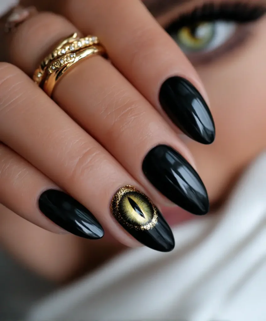 A mix of black base with golden cat eye shimmer offers instant drama, much like black marble with gold veining in luxury interiors.