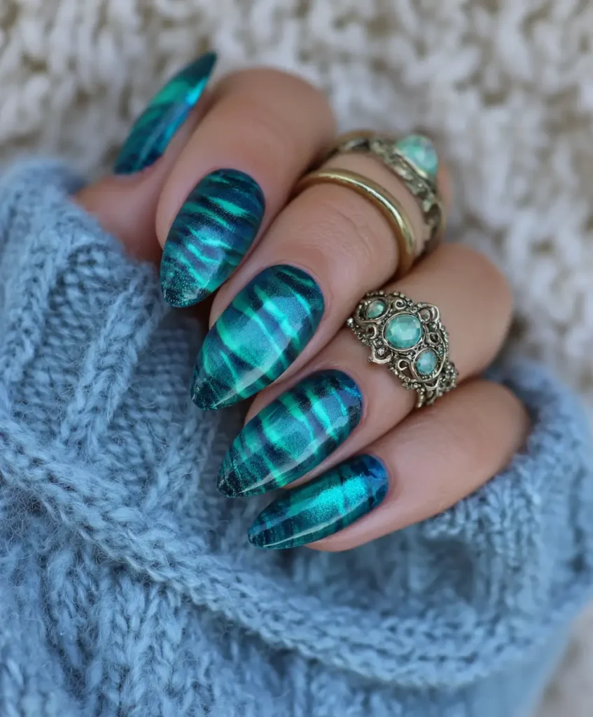 Teal cat eye nails with iridescent shimmer resemble ocean waves catching sunlight. They’re playful but elegant, ideal for summer.